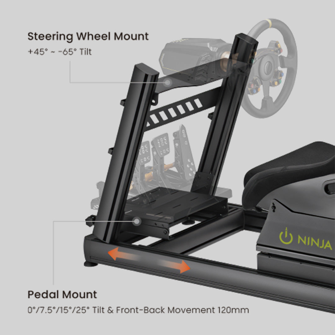 Adjustable mounts for steering wheel, pedals, and gear shifter allow for personalized angle and distance settings with precise positioning.