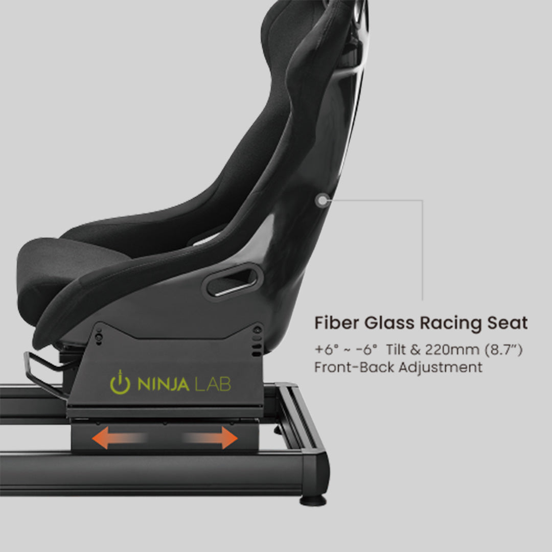 Adjustable fiberglass bucket seat for forward/back sliding, reclining, and enduring comfort over long gaming hours.